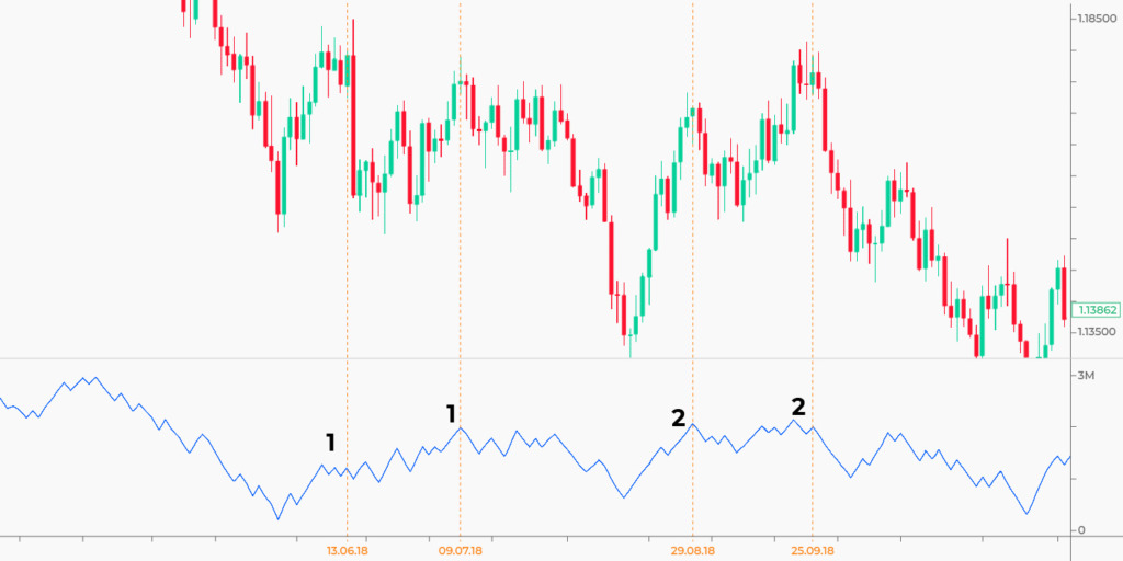 In the first case, the price formed a lower high, but the indicator continued rising. It was a signal bears weren’t strong enough to pull the price down. In the second case, the price formed a higher high, but the indicator didn’t follow. Afterwards, the price formed a bearish trend.