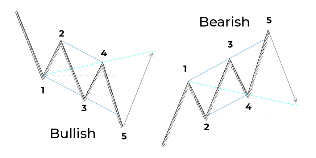 Pola bullish terlihat descending channel yang membentuk 4 gelombang dari pola Wolfe. Di sini, price secara progresif akan membuat lower low dan lower high yang menggambarkan downward trend. Setelah channel breakout, gelombang ke-5 akan terbentuk.